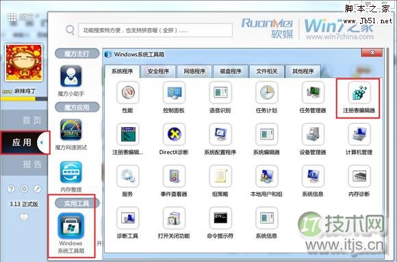 打开注册表,可以选择在“开始菜单”中搜索“regedit”,回车运行,或者Win+R,打开“运行”窗口,键入“regedit”,回车运行,或者打开魔方优化大师,IT技术网在“应用”中找到“Windows系统工具箱”,打开“注册表编辑器”也可。