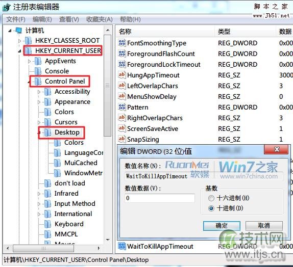 然后依次展开到“HKEY_CURRENT_USERControl PanelDesktop”,然后在右侧窗口空白处右键单击,选择“新建”,“DWORD 32位值”(PS:注意键值类型),并将其重命名为“WaitToKillAppTimeout”(PS:某些卫士软件有此功能,可能有些朋友已经有此键值,那么无需新建,只需进行后续操作),同时把该键值的数值修改为0,点击“确定”之后就可以关闭注册表编辑器了。