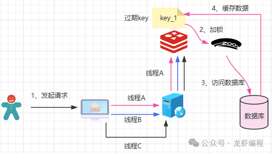 缓存击穿是指某个热点数据A在缓存中失效的瞬间,此时又有大量的并发请求同时访问该数据A,由于数据A在缓存中失效,大量请求同时访问数据库,造成数据库压力骤增。这种情况通常发生在热点数据或访问频繁的数据上,如下如图所示的: