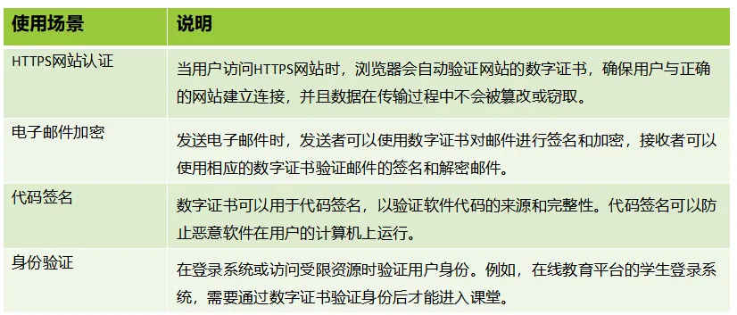 数字证书的应用非常广泛,常见的使用场景参见下表。