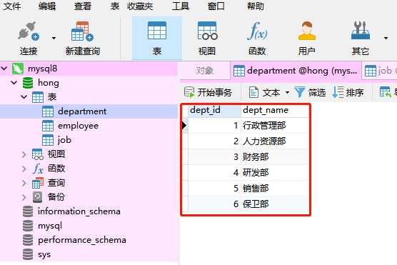 我们首先看一下数据库里面有一个 department这个部门表。仅用据库这个表里有六条数据,行代现数分别代表不同的码实部门。