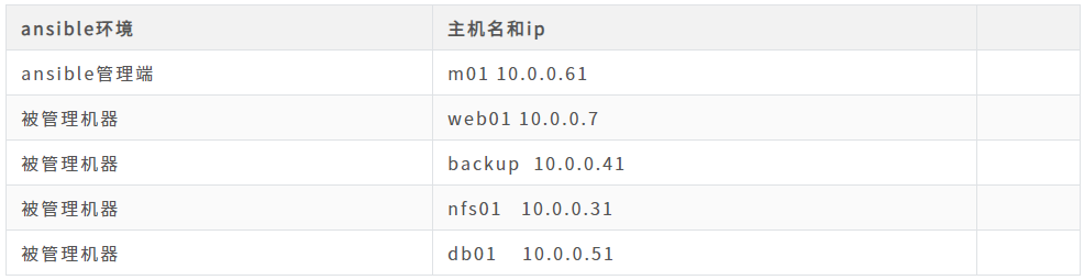 [root@m01 ~]# ansible all -m command -a hostname 172.16.1.51 | CHANGED | rc=0 >> db01 172.16.1.41 | CHANGED | rc=0 >> backup 172.16.1.31 | CHANGED | rc=0 >> nfs01 172.16.1.7 | CHANGED | rc=0 >> web01 [root@m01 ~]#案例04:查看某一台机器