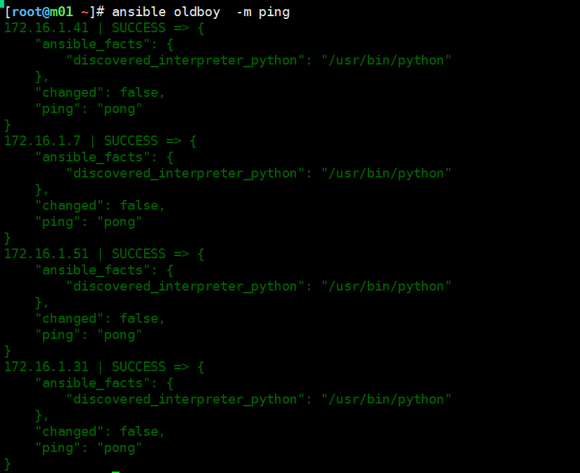 [root@m01 ~]# cat /etc/ansible/hosts [oldboy] 172.16.1.7 172.16.1.31 172.16.1.41 172.16.1.51与Ansible的第1次接触
