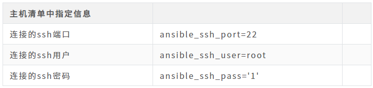 [root@m01 ~]# cat /etc/ansible/hosts [oldboy] #[组的名字] 172.16.1.7 172.16.1.31 172.16.1.41 172.16.1.51 [web] 172.16.1.7 [db] 172.16.1.51 [nfs] 172.16.1.31 [backup] 172.16.1.41指定用户名、密码、松提升工端口