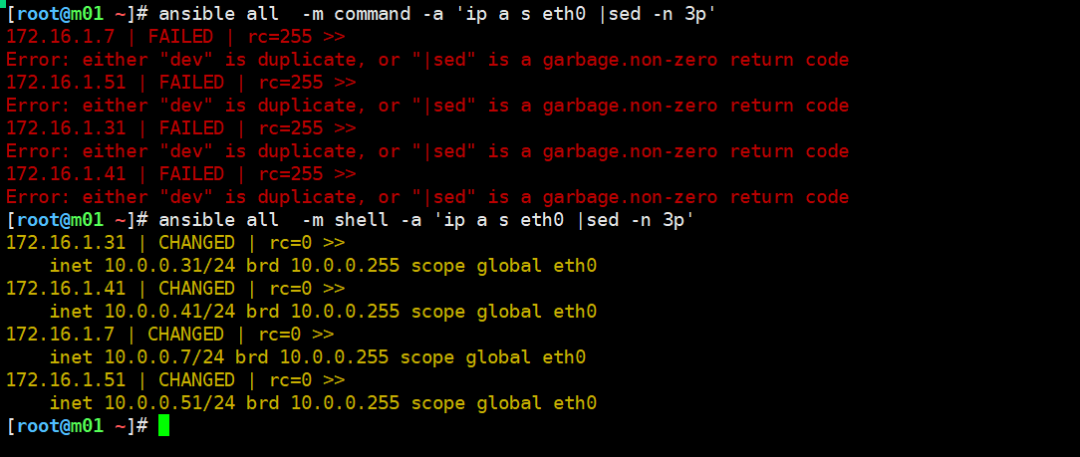 [root@m01 ~]# ansible all -m command -a ip a s eth0 |sed -n 3p 172.16.1.7 | FAILED | rc=255 >> Error: either "dev" is duplicate, or "|sed" is a garbage.non-zero return code 172.16.1.51 | FAILED | rc=255 >> Error: either "dev" is duplicate, or "|sed" is a garbage.non-zero return code 172.16.1.31 | FAILED | rc=255 >> Error: either "dev" is duplicate, or "|sed" is a garbage.non-zero return code 172.16.1.41 | FAILED | rc=255 >> Error: either "dev" is duplicate, or "|sed" is a garbage.non-zero return code [root@m01 ~]# ansible all -m shell -a ip a s eth0 |sed -n 3p 172.16.1.31 | CHANGED | rc=0 >> inet 10.0.0.31/24 brd 10.0.0.255 scope global eth0 172.16.1.41 | CHANGED | rc=0 >> inet 10.0.0.41/24 brd 10.0.0.255 scope global eth0 172.16.1.7 | CHANGED | rc=0 >> inet 10.0.0.7/24 brd 10.0.0.255 scope global eth0 172.16.1.51 | CHANGED | rc=0 >> inet 10.0.0.51/24 brd 10.0.0.255 scope global eth0