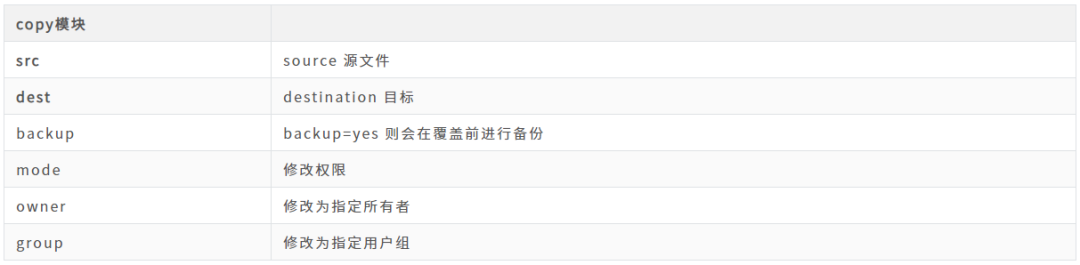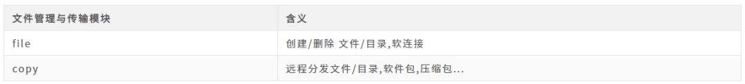 ansible all -m copy -a src=/etc/hosts dest=/etc/hosts backup=yes [root@m01 ~]# ansible all -m shell -a ls -l /etc/hosts* 172.16.1.41 | CHANGED | rc=0 >> -rw-r--r-- 1 root root 328 Apr 12 12:24 /etc/hosts -rw-r--r-- 1 root root 327 Apr 12 12:21 /etc/hosts.81057.2022-04-12@12:24:20~ -rw-r--r--. 1 root root 370 Jun 7 2013 /etc/hosts.allow -rw-r--r--. 1 root root 460 Jun 7 2013 /etc/hosts.deny 172.16.1.7 | CHANGED | rc=0 >> -rw-r--r-- 1 root root 328 Apr 12 12:24 /etc/hosts -rw-r--r-- 1 root root 327 Apr 12 12:21 /etc/hosts.18115.2022-04-12@12:24:20~ -rw-r--r--. 1 root root 370 Jun 7 2013 /etc/hosts.allow -rw-r--r--. 1 root root 460 Jun 7 2013 /etc/hosts.deny 172.16.1.31 | CHANGED | rc=0 >> -rw-r--r-- 1 root root 328 Apr 12 12:24 /etc/hosts -rw-r--r-- 1 root root 327 Apr 12 12:21 /etc/hosts.46979.2022-04-12@12:24:20~ -rw-r--r--. 1 root root 370 Jun 7 2013 /etc/hosts.allow -rw-r--r--. 1 root root 460 Jun 7 2013 /etc/hosts.deny 172.16.1.51 | CHANGED | rc=0 >> -rw-r--r-- 1 root root 328 Apr 12 12:24 /etc/hosts -rw-r--r-- 1 root root 327 Apr 12 12:21 /etc/hosts.21455.2022-04-12@12:24:20~ -rw-r--r--. 1 root root 370 Jun 7 2013 /etc/hosts.allow -rw-r--r--. 1 root root 460 Jun 7 2013 /etc/hosts.deny3)文件管理与传输模块小结
