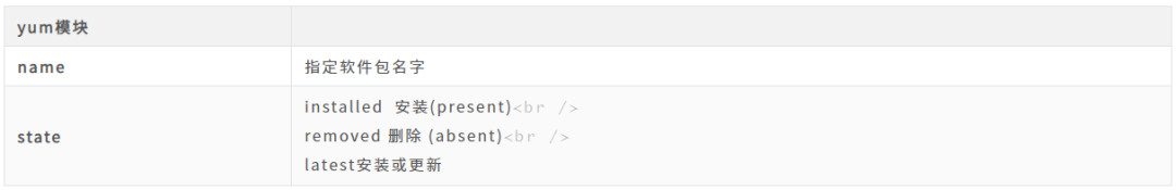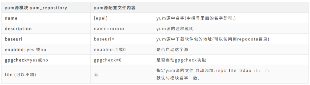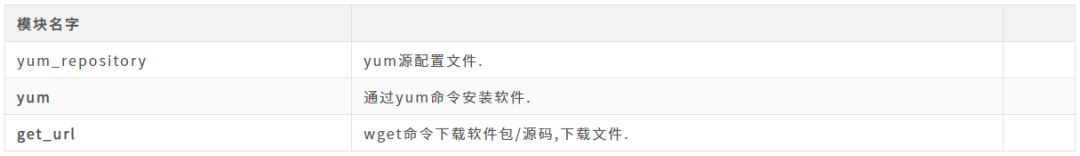 [nginx] name=nginx stable repo baseurl=http://nginx.org/packages/centos/$releasever/$basearch/ gpgcheck=1 enabled=1 gpgkey=https://nginx.org/keys/nginx_signing.key ansible web -m yum_repository -a name=nginx description="nginx stable repo" baseurl="http://nginx.org/packages/centos/$releasever/$basearch/" gpgcheck=no enabled=yes #注意未来也可以通过,copy模块实现.2)yum模块