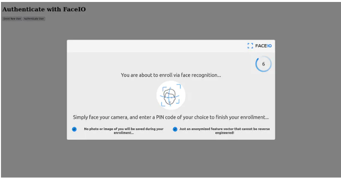 复制authenticate.addEventListener("click", async () => {let response = await faceio.authenticate({locale: "auto",});console.log(` Unique Facial ID: ${response.facialId}PayLoad: ${response.payload}`);});1.2.3.4.5.6.7.8.当用户按下认证按钮时,屏幕上会弹出类似注册功能的界面。它同样需要您的摄像头访问权限,以扫描面部信息。扫描完成后,它会要求您输入在注册期间设置的PIN码。如果PIN码提供正确,FaceIO会返回您在注册过程中设定的面部数据和有效负载。