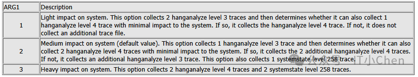 此选项收集2个hanganalyze级别3跟踪,然后确定它是否也可以在对系统影响最小的情况下收集1个hanganalyse级别4跟踪。如果是这样,它将收集hanganalyze 4级跟踪。如果没有,则不会收集其他跟踪文件。