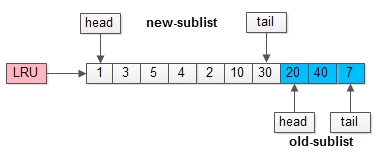 整个LRU长度是10;前70%是新生代;后30%是老生代;新老生代首尾相连;