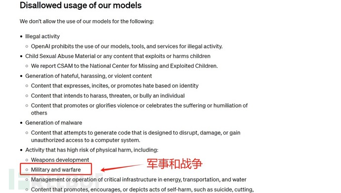 在上周的其技修改后,OpenAI在“通用政策”条款中虽然也有“不要使用公司服务伤害自己或他人”,用于用途并明确表示禁止“AI开发或操纵武器”,但军事这一关键限制性词汇,却从政策中消失了。