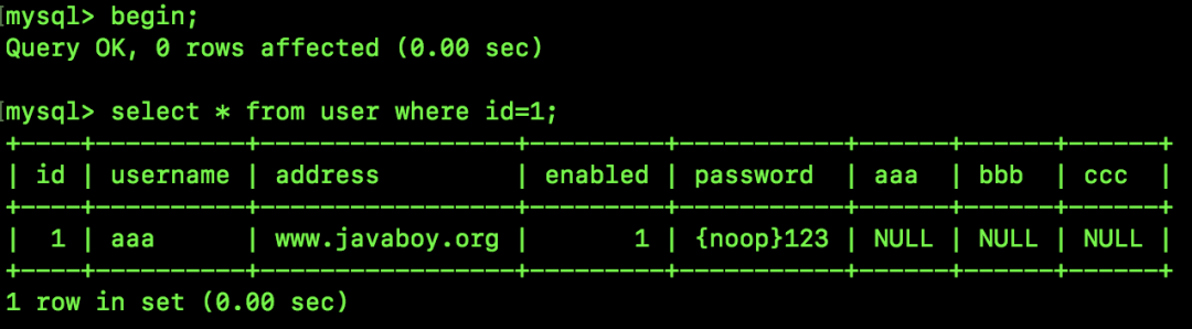 首先在 A 会话中开启事务并查询 id 为 1 的记录:
