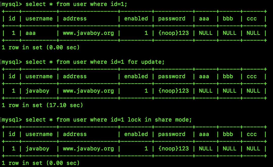 复制update user set username=javaboy where id=1;1.上面这个更新语句内部会获取 X 锁,对于一些手动添加了 X 锁的查询语句,也会阻塞,例如下面这个: