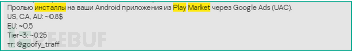安装为了增加恶意应用程序的下载量,许多攻击者通过谷歌广告来增加销路。与其他暗网服务不同,这项服务是完全合法的,并被用于吸引尽可能多的应用程序下载——无论它是仍然合法的应用程序还是已被感染的应用程序。安装成本取决于目标国家。平均价格为0.5美元,具体报价从0.1美元到1美元不等。其中,针对美国和澳大利亚用户的广告成本最高,为0.8美元。