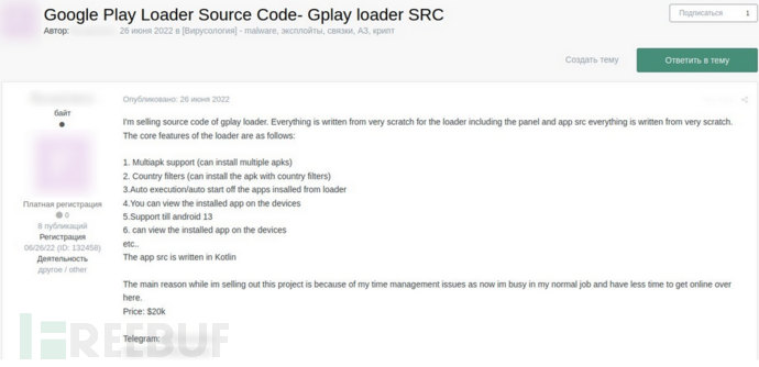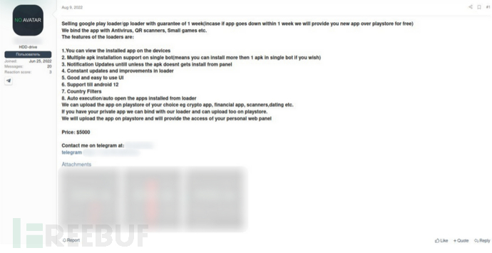 其他服务暗网卖家还提供为买家发布恶意或流氓应用程序的服务。在这种情况下,买家不会直接与Google Play互动,但可以远程接收应用程序活动的成果,例如,被其窃取的所有受害者数据。