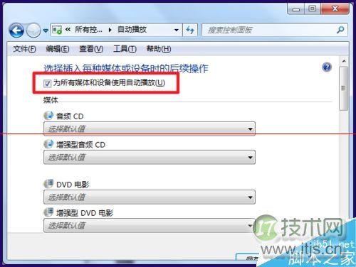 4、播放就可以设置自动播放了,禁止去掉最前面的统位【为所有媒体和设备使用自动播放】的勾选,以后所有的置设置的自动设备就不会出现自动播放的窗口了