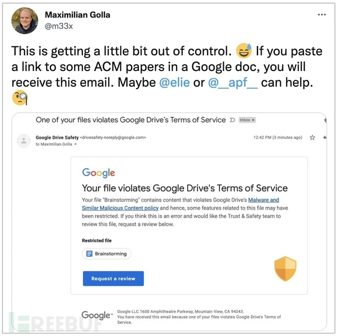 研究人员的 Google Docs 文件被标记为包含 ACM 链接