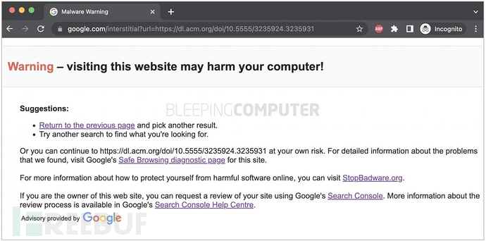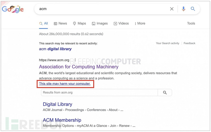 安全人员测试后发现,单击结果中出现的任何 acm.org 、 dl.acm.org 或library.acm.org链接会导致在 Google 的重定向页面上托管一个“插页式”,警告访问者该链接可能有害。