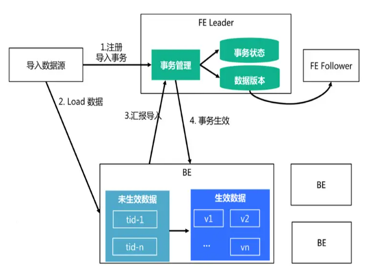 同时,每一个导入作业都会生成一个Label,这个Label是在数据库内用于唯一区分一个导入任务。Label可以由用户指定,部分导入功能也会由系统自动生成。Label用于保证对应的导入作业仅能成功导入一次,一个成功导入的Label再次使用时,会被拒绝并报错Label already used。通过这个机制,数据消费侧可以实现At-Most-Once语义。如果结合上游系统的At-Least-Once语义,则可以实现端到端数据导入的Exactly-Once语义。数据导入流程如图3所示。