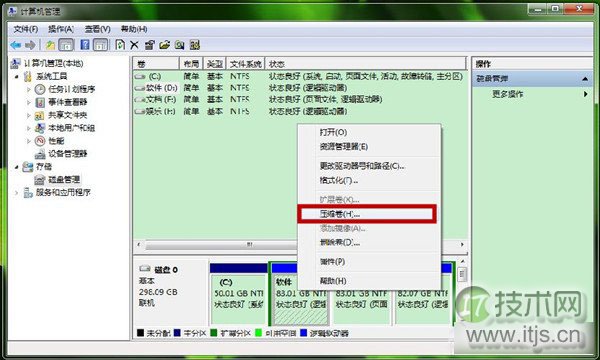 第三步、通过判断,服务器托管我们右键点击空间比较多磁盘分区 ,选中“压缩卷”。