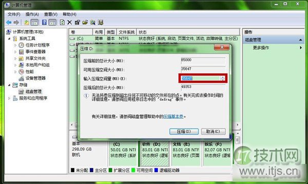 第五步、系统会弹出“压缩”窗口,可输入部分默认的是:可压缩容量。我们可以输入想获得以M为单位的磁盘容量,多少可以自定,注意1G=1024M,然后再点击“压缩”。