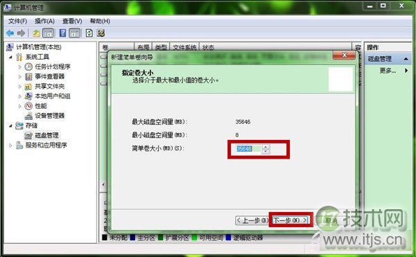 第九步、选择简单卷大小,可以自我调节,站群服务器再点击“下一步”。