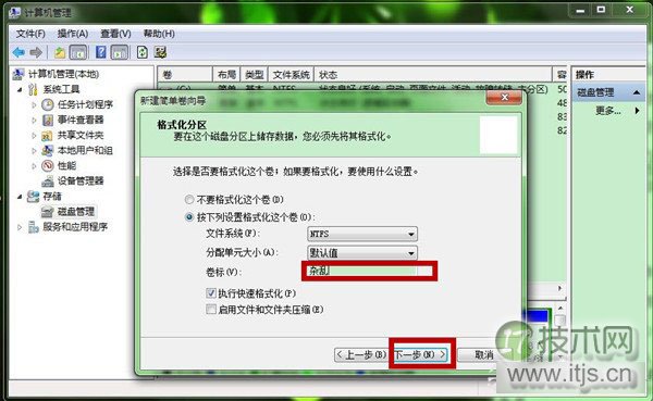 第十一步、我们再“格式化分区”中,可以为这个新加卷命名,再点击“下一步”。