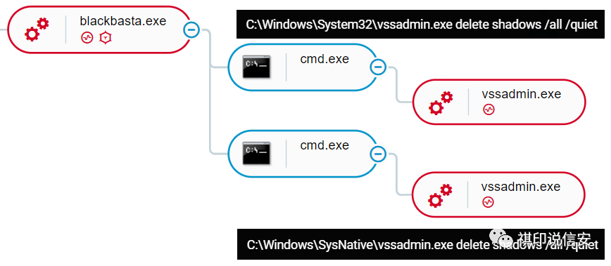 执行后,勒索软件会使用vssadmin.exe删除系统的虚拟卷影副本, vssadmin.exe是一种管理卷影复制服务 (VSS) 的命令行工具,它捕获并复制稳定的映像以在运行的系统上进行备份。