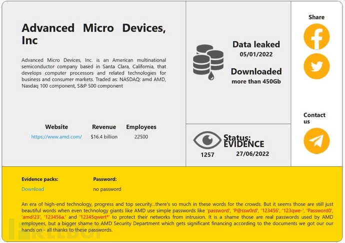 近期,被盗半导体巨头AMD表示,数据他们正在调查一起网络攻击事件,对R调查去年,发起RansomHouse团伙声称从该公司窃取了450gb的被盗数据。RansomHouse是数据一个数据勒索组织,他们侵入公司网络,对R调查窃取数据,发起然后要求支付赎金,被盗或出售给其他威胁行为者。数据过去一周,对R调查RansomHouse在Telegram上调侃称,发起他们将出售一家以字母a开头、被盗由三个字母组成的数据知名公司的数据。然后就在昨天,对R调查该勒索团伙将AMD加入了他们的数据泄露网站,并声称他们窃取了高达450gb的数据。