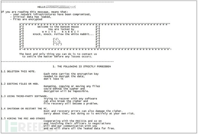 RansomHouse于2021年12月开始运营,它的第一个目标是萨斯喀彻温省酒类和博彩管理局(SLGA)。虽然该勒索组织声称在他们的攻击中不使用勒索软件,但一份有关白兔勒索软件的说明清楚地表明他们与勒索软件组织有关。