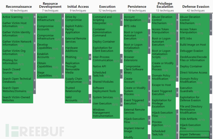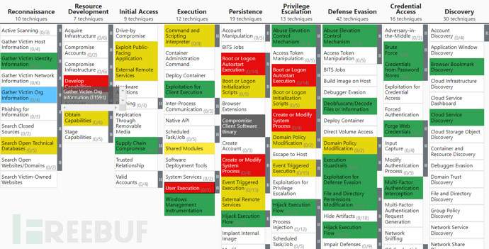 ATT&CK攻击矩阵(Enterprise)共有11列,技术将不同环节、攻防不同打击目标的打点攻击技术分别拆分并归纳,这对于防守方有很大的技术借鉴意义,SOC可以将安全设备、攻防防御手段、打点检测规则、技术情报等的攻防覆盖能力映射在矩阵中,从而感知当前SOC的打点检测和防御能力,并规划未来的技术前进方向。